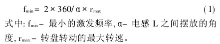 LC传感器的激发频率与转盘的最大转动频率有关,而且还与系统中LC传感器个数、电感L之间的摆放角度和转盘上金属面的角度有关,公式(1)为转盘上金属面为半面时LC传感器的激发频率的计算公式。