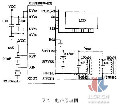 以上分别分析了MSP430FW42x单片机的ScanIF模块中各部分的功能,下面给出了其与具体LC传感器的连接电路图。如图2所示。