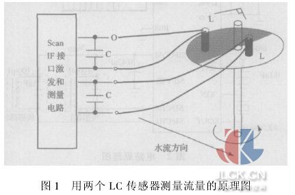 转盘的转速是用LC传感器[4]来测量的。在转盘的上面成90度角放置两个电感线圈,再把它们同电路中的两个电容并联形成两个LC谐振电路,通过这两个谐振电路就可以测量转盘的转向和转速,进而测量出热水的流向和流量来。其测量原理如图1所示。
