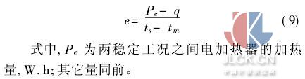 式中,D为工况运行前后内能的变化量,W.h;e为水和箱体的总热容,W.h/℃;q为箱体漏热量,W.h;ts为开始水温,℃;tm为结束水温,℃。