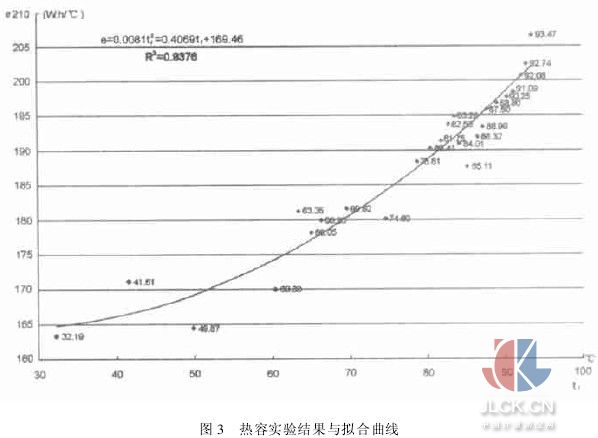 从试验数值可以看出水箱和水的总热容不是一个常数,是随温度而变的函数,根据实验数据作二次曲线拟合,从而得出总热容与温度的函数式为:
