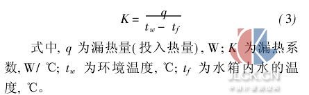 维持加热水箱的功率恒定,连续监测水箱内外温度。当水箱内外温差的变化在两个小时内小于0·3℃时,可认为系统已经达到热平衡稳定状态,这时水箱的加热量q等于漏热量。根据温差和投入热量由式(3)得到漏热系数K。