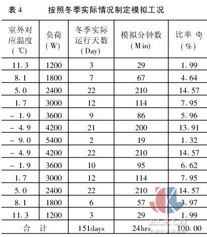 热量表整体检定的一个优势就是可以模拟冬季实际运行的情况来考验热量表在接近真实情况下的准确度。以北京为例,一套建筑面积100m2的住房,设计外温(-9℃)和设计室内温度为18℃条件下,设计负荷为54W/m2,则需要投入的总能量E为267·66MJ。可以通过24小时的试验来模拟一个冬季的实际运行情况,模拟工况如表4。