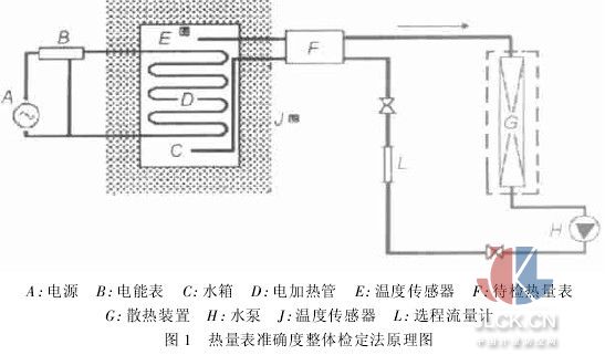 目前世界各国采用的大都是分部检定的方法,即在热量表准确度检定时,分别对热量表的三个组成部分:流量传感器、温度传感器和计算器等分别进行检定,然后根据误差分析理论合成热量测量的准确度。热量表准确度整体检定法是把热量表作为一个整体进行检测,而不是对流量传感器、温度传感器和计算器分别进行检定。如图1所示,根据能量守恒,通过电测法来实现。其中,电加热器D负责提供能量,电能表B记录电能,被加热的水在水泵H的驱动下,经过待测热量表F进入散热装置G散热降温,降温后的水又经过待测热量表F回到绝热水箱C。