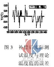 由于温度与阻值之间的关系存在明显的非线性,所以在实际使用时必须进行标定。通过实验来确定温度补偿参数,一般可采用查表分段补偿法。利用0.01%精密电阻箱进行实验,得到图2和图3两组数据曲线。实际使用时,由于配对的温度传感器PT1000之间允许有0.15~0.3℃测量偏差,入口和出口的温度测量误差会增大,如果需要更精确的测量精度,可以用恒温箱标定获取温度补偿参数。