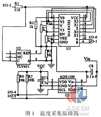 I/O 2用来控制MAX4582和TLV431的供电。进行温度采样时,先将I/O 2引脚置1采样结束后I/O 2引脚清0,有效地降低了系统的功耗。