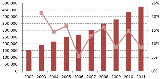 图2:2002-2011中国城市供暖面积(万平方米)及增速