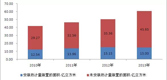2013年,根据住房和城乡建设厅统计数据显示,北方供暖区域供暖面积为55.56亿平方米,其中,安装热计量装置的面积只有15亿平方米,不到供热面积的1/3。