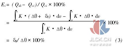 由热能表的两种计算公式可以看出,为了使热能表有比较高的准确度,除了要求配对温度传感器能够比较准确地各自测出热交换器系统进、出口处传热介质的温度外,更重要的是要使二者的差值更加符合规定的标准差值。所以要求生产厂再组装热能表时,要根据单支温度传感器的检定结果进行合理配对,即选取误差方向相同,大小基本相等的进行搭配。例如,热能表所采用的温度传感器单支精度为±0.5℃,如果随意配对,则可引起的最大温差测量误差可达±1℃,如果经过挑选配对,温差测量误差控制在±0.1℃以内也没问题。仅考虑此因素对精度的影响,设温差测量误差为δθ,由热能表的相对误差计算公式并代入式(2)得: