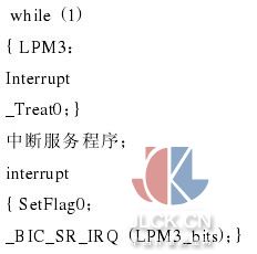 MSP430 通过各种模块的智能化运行管理和 CPU的状态组合达到超低功耗的各种要求。一个中断事件可将系统从各种省电工作模式中唤醒,而 RETI 指令又使 MSP430 返回到中断事件发生前的工作模式。