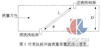 图 1 中有两个超声波换能器:顺流换能器和逆流换能器,两只换能器分别安装在流体管线的两侧并相距一定距离,管线的内直径为 D,超声波行走的路径长度为 L, 超声波顺流时间为 tu, 逆流时间为 td, 超声波的传播方向与流体的流动方向夹角为 。由于流体流动的原因,使超声波顺流传播 L 长度的距离所用的时间比逆流传播所用的时间短,顺流和逆流时间可表示为: