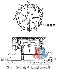 单流束基表水流形式如图 1 所示。水流从进水口进入基表, 冲击叶片转动, 在出水口流出基表; 由于其流束形式决定了水流在基表内部有比较大的流动空间, 不易被污水所堵塞, 比较适合我国国情, 其产品目前还有一定的生存空间。但其缺点也很明显, 由于水流对叶片的冲击不对称, 叶轮的受力载荷容易产生波动,使叶轮在转动过程中产生周向和径向振动, 从而影响流量检测准确度。多流束基表水流形式如图2所示, 水流经基表进口进入基表, 靠导流叶片形成多通道, 将水从不同的方向导入叶轮室, 形成对叶轮的均匀对称冲击, 较好地避免了水流对叶片造成的轴向和径向振动, 提高了叶轮工作的稳定性, 因此, 准确度较高的基表多采用多流束基表。考虑到技术的长远有效性和二级表的准确度要求,本方案采用了多流束基表方案, 其基本结构如图3所示。