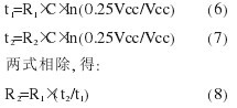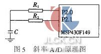温度测量采用斜率 A/D 电路,电路如图5 所示。本方案采用的控制芯片为 MSP430F147, 其内部有高精度比较器, 可以实现电阻的准确测量, 从而实现温度的测量。图中R1为参考电阻, R2为待测电阻, 在R2一侧添加有滤波电路。电阻和电容C组成一个RC电路, 当电容C不变时,电容的充放电时间只取决于电阻。若用同一个电容C分别与参考电阻R1和待测电阻R2组成RC电路, 然后分别测量它们的放电时间, 就可以测量出R2的阻值。具体做法是:P2.1 为单片机比较器的输入引脚, 测量时对电容C充电使电压达到电源电压 Vcc,充电结束后让 P2.0 口与地线导通,使电容通过参考电阻R1放电。当电容电压降到 0.25Vcc 时, 比较器产生中断, 记录下电容的放电时间t1。然后再次对电容充电, 充完电后P2.1 口与地线导通, 电容通过待测电阻R2放电, 记录下放电时间t2。电容的放电时间和电阻的大小有关,放电时间的计算公式为:
